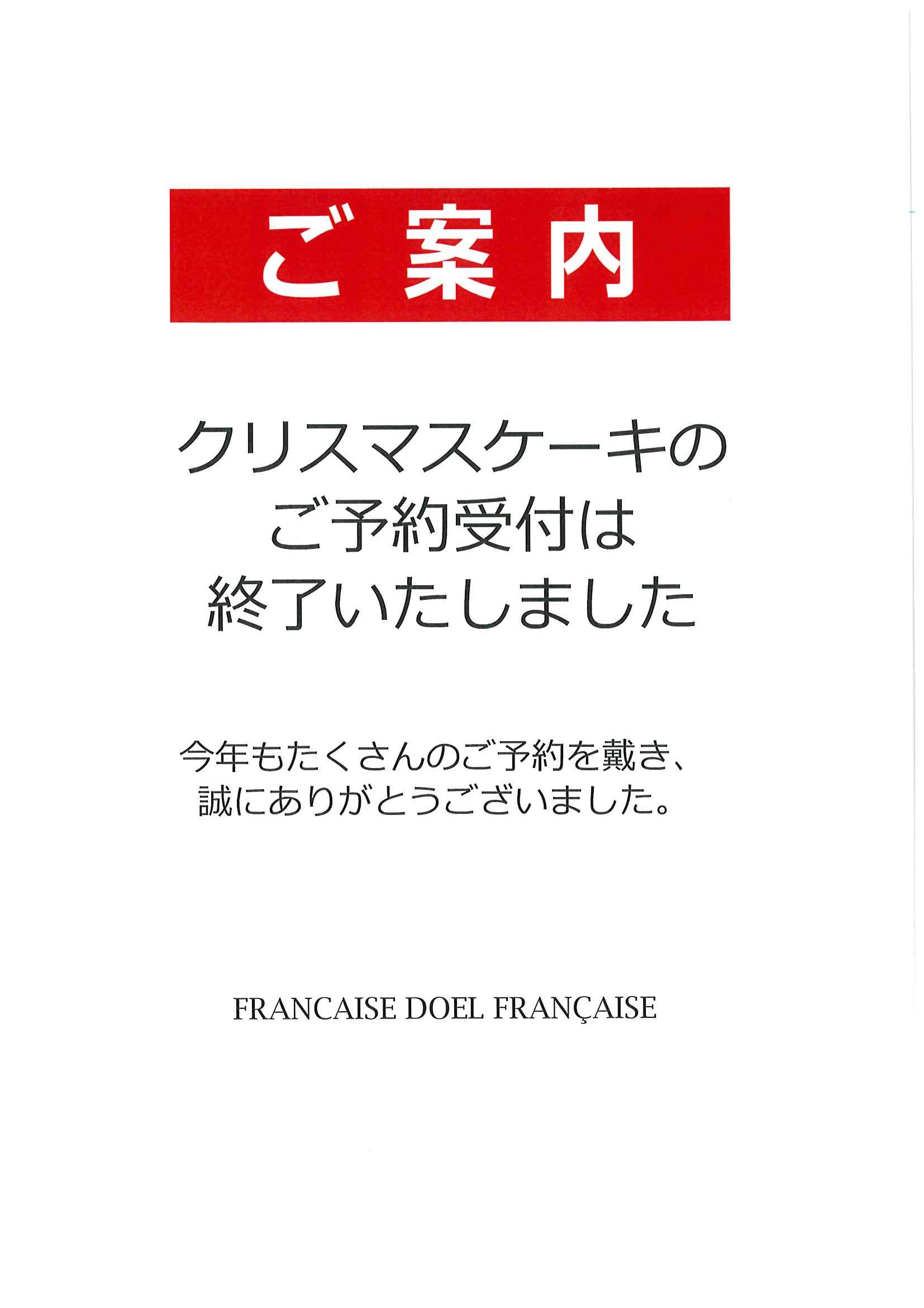 2025.11.16 2025年 クリスマスケーキのご案内※ご予約受付終了いたしました※ 11月16日よりクリスマスケーキのご予約承りを開始させていただきました。予定数に達し次第、締め切りの12月18日よりもだいぶ早く受付を終了させていただく商品もございますので、どうぞよろしくお願いいたします。 ご予約時に、下記のご注意点をご予約伝票とともにお渡ししておりますので、大変恐縮ではございますが、当日の混乱を避けてスムーズなお渡しをするためにご協力をいただければ幸いでございます。