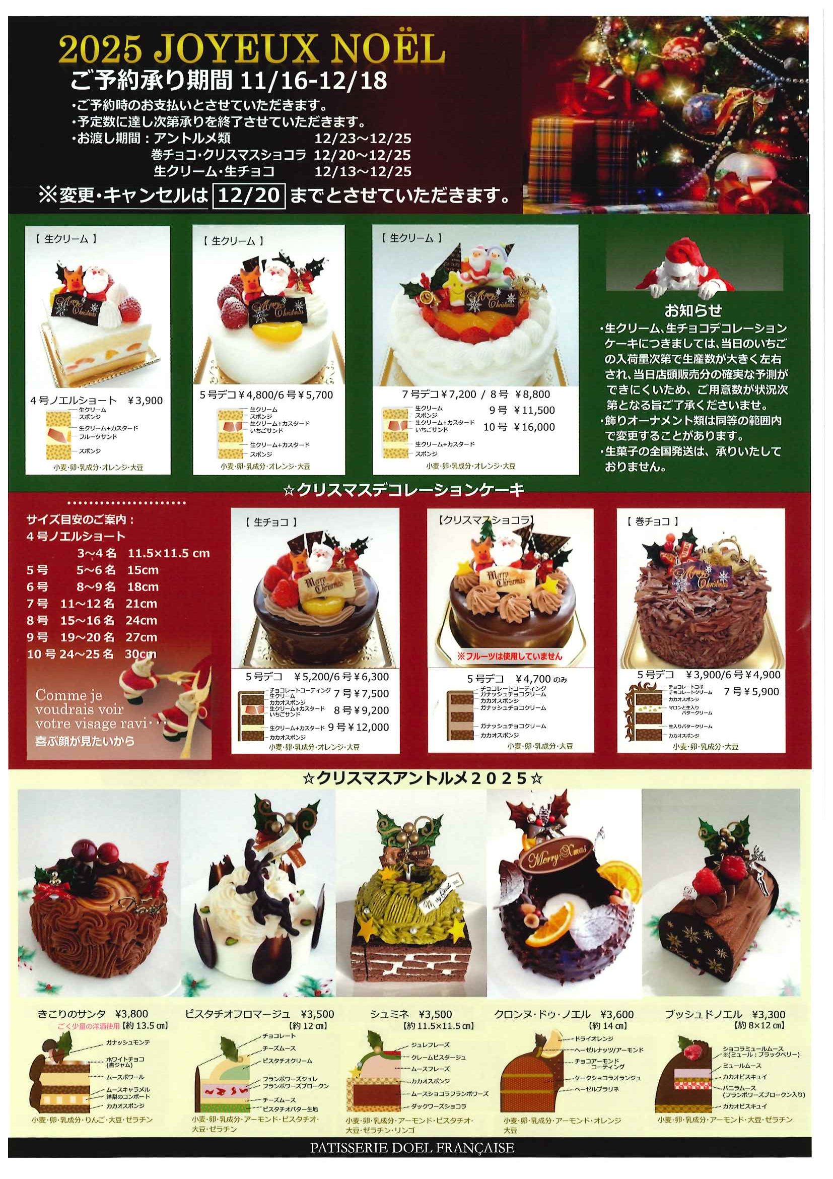 2025.11.16 2025年 クリスマスケーキのご案内 11月16日よりクリスマスケーキのご予約承りを開始させていただきました。予定数に達し次第、締め切りの12月18日よりもだいぶ早く受付を終了させていただく商品もございますので、どうぞよろしくお願いいたします。 ご予約時に、下記のご注意点をご予約伝票とともにお渡ししておりますので、大変恐縮ではございますが、当日の混乱を避けてスムーズなお渡しをするためにご協力をいただければ幸いでございます。
